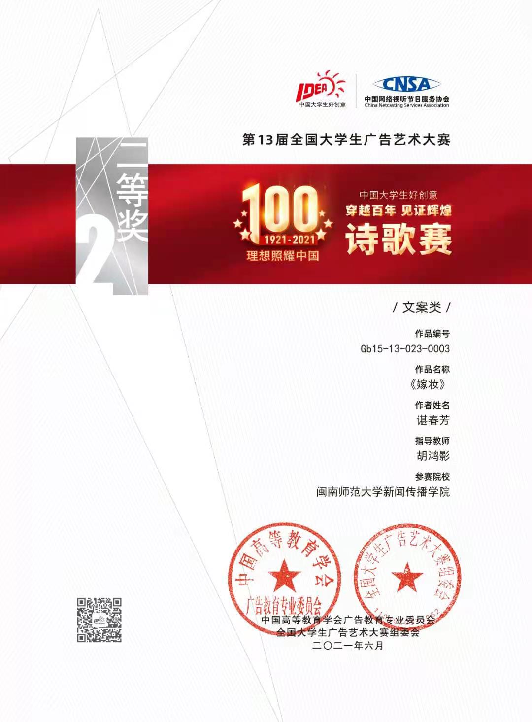第十三屆全國大學(xué)生廣告藝術(shù)大賽“詩歌賽”評審結(jié)果于日前揭曉,由我校新聞傳播學(xué)院教師胡鴻影指導(dǎo)、2020級研究生諶春芳同學(xué)的作品《嫁妝》在此次大賽中斬獲文案類二等獎。