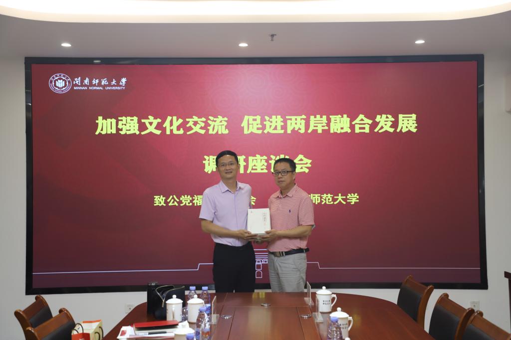 校黨委副書記、校長李順興向致公黨福建省委會專職副主委吳棉國贈送《臺灣通史》(六卷本)