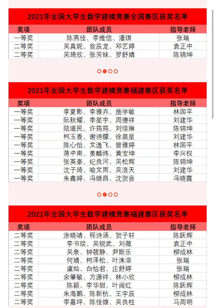 近日,2021年“高教社杯”全國大學生數學建模競賽獲獎名單揭曉,我校數學與統計學院張瑞老師指導的陳燕佳、李維信、潘琪團隊榮獲全國一等獎,由袁正中老師指導的吳真妮、翁辰龍、鄧藝婷團隊和由陳錦坤老師指導的吳琦欣、張芳妹、羅舒婧團隊分別獲得全國二等獎。此外,還有18支隊伍分獲福建賽區一、二等獎。