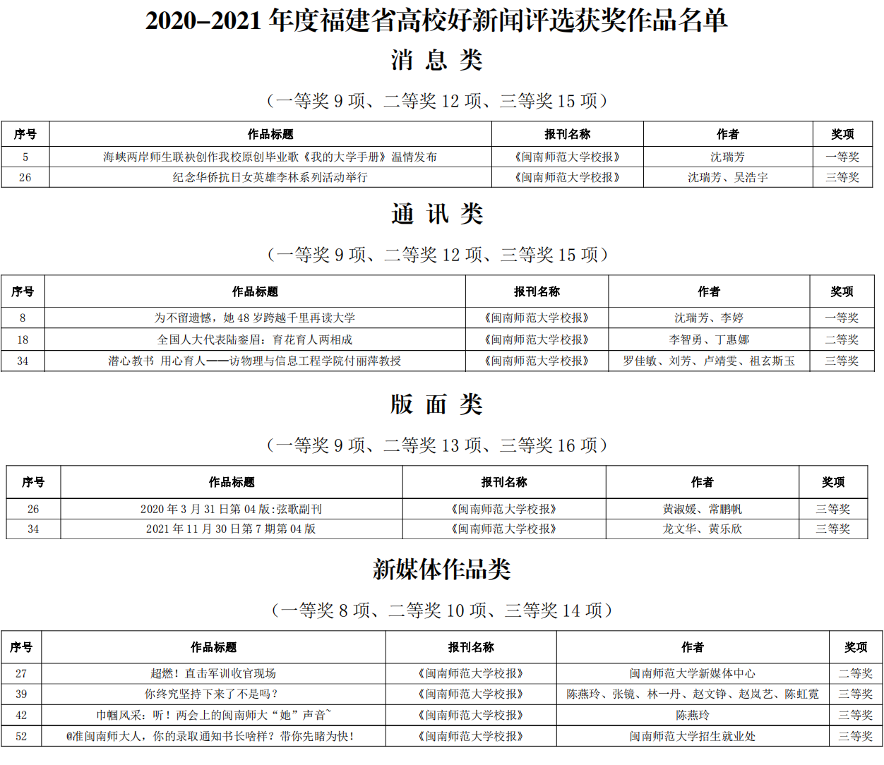 據(jù)悉,福建省高校好新聞評選活動旨在進(jìn)一步學(xué)習(xí)宣傳貫徹習(xí)近平新時代中國特色社會主義思想,展示福建省高校新聞宣傳工作成果,更好地發(fā)揮優(yōu)秀新聞作品的示范效應(yīng),不斷開創(chuàng)融媒體時代學(xué)校宣傳思想工作新局面。2020-2021年度福建省高校好新聞評選活動共收到26所高校推薦的354件參賽作品,共評出消息類、評論類、通訊類、版面類、新聞攝影作品類、新媒體作品類六大類獲獎作品188件,其中一等獎46項、二等獎62項、三等獎80項。