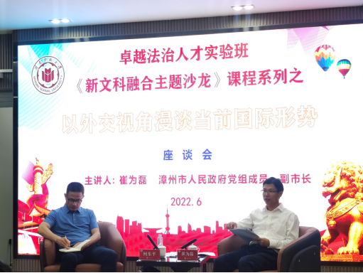 6月9日,法學院在達理樓南區206教室舉辦新文科融合主題學術沙龍,邀請漳州市政府黨組成員、副市長崔為磊為法學院師生講授題為《以外交視角漫談當前國際形勢》的專題講座。校黨委常委、副校長張龍海,黨委常委、紀委書記戴福康出席活動,法學院、海外教育學院相關負責人和法學院部分師生參加活動,活動由法學院院長何東平主持。
