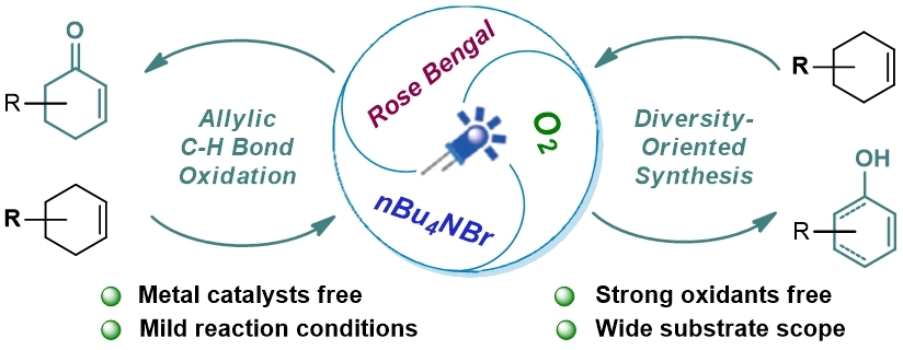 烯烴氧化生成相應的烯丙醇或不飽和烯酮類化合物是一類基本的有機反應,在有機合成中扮演著極其重要的作用,新型氧化試劑和催化方法的開發與應用是目前有機合成化學中最活躍的研究領域之一。雖然目前已經發展出了一系列烯烴轉化成不飽和烯酮的方法,但在已報道的方法中,往往需要使用到毒性較大且化學計量較多的金屬基氧化劑(如二氧化硒、三氧化鉻、氯鉻酸吡啶和重鉻酸吡啶等)或者昂貴的過渡金屬催化劑,導致這些方法存在區域選擇性較差、反應條件較苛刻以及官能團容忍度較低等缺點。