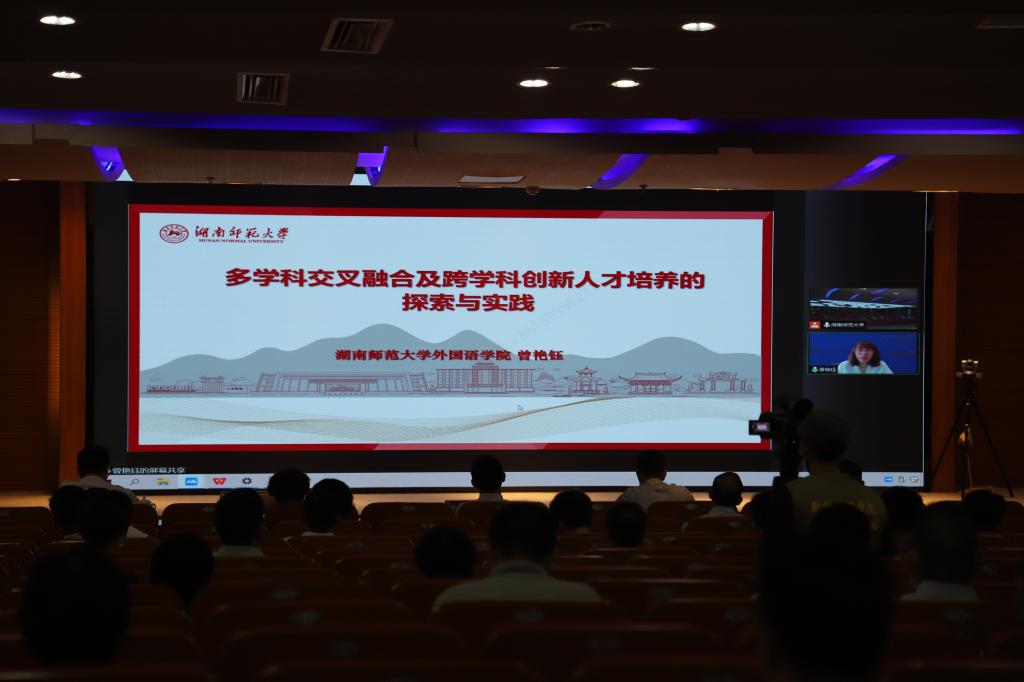 隨后,曾艷鈺教授作了題為《多學(xué)科交叉融合及跨學(xué)科創(chuàng)新人才培養(yǎng)的探索與實(shí)踐》的專題報(bào)告。她從“轉(zhuǎn)變理念,搭建跨學(xué)科平臺(tái)”“打造多學(xué)科交叉融合的大團(tuán)隊(duì)”“構(gòu)建多學(xué)科交叉融合復(fù)合型人才培養(yǎng)體系”三個(gè)方面,介紹了湖南師范大學(xué)外國(guó)語(yǔ)學(xué)院在推動(dòng)多學(xué)科交叉融合和跨學(xué)科創(chuàng)新人才培養(yǎng)方面的做法。曾艷鈺教授重點(diǎn)介紹了湖南師范大學(xué)在學(xué)校層面、學(xué)科層面打造的“雙一流”跨學(xué)科創(chuàng)新平臺(tái),以及依托這些平臺(tái)培育的高水平跨學(xué)科、跨領(lǐng)域創(chuàng)新團(tuán)隊(duì)。她通過(guò)豐富的案例,分享了湖南師范大學(xué)外國(guó)語(yǔ)學(xué)院培養(yǎng)多學(xué)科交叉融合復(fù)合型人才的具體做法,特別是在課程設(shè)置、教材建設(shè)、搭建跨學(xué)科人才培養(yǎng)實(shí)踐平臺(tái)等方面的創(chuàng)新和探索。她強(qiáng)調(diào),推進(jìn)多學(xué)科交叉融合及跨學(xué)科人才培養(yǎng),要轉(zhuǎn)變理念,處理好學(xué)科交叉融合與交叉學(xué)科建設(shè)之間的關(guān)系;要從學(xué)校、學(xué)科群、團(tuán)隊(duì)、學(xué)院等層面加強(qiáng)機(jī)制保障;要主動(dòng)作為,堅(jiān)持互惠共享理念。