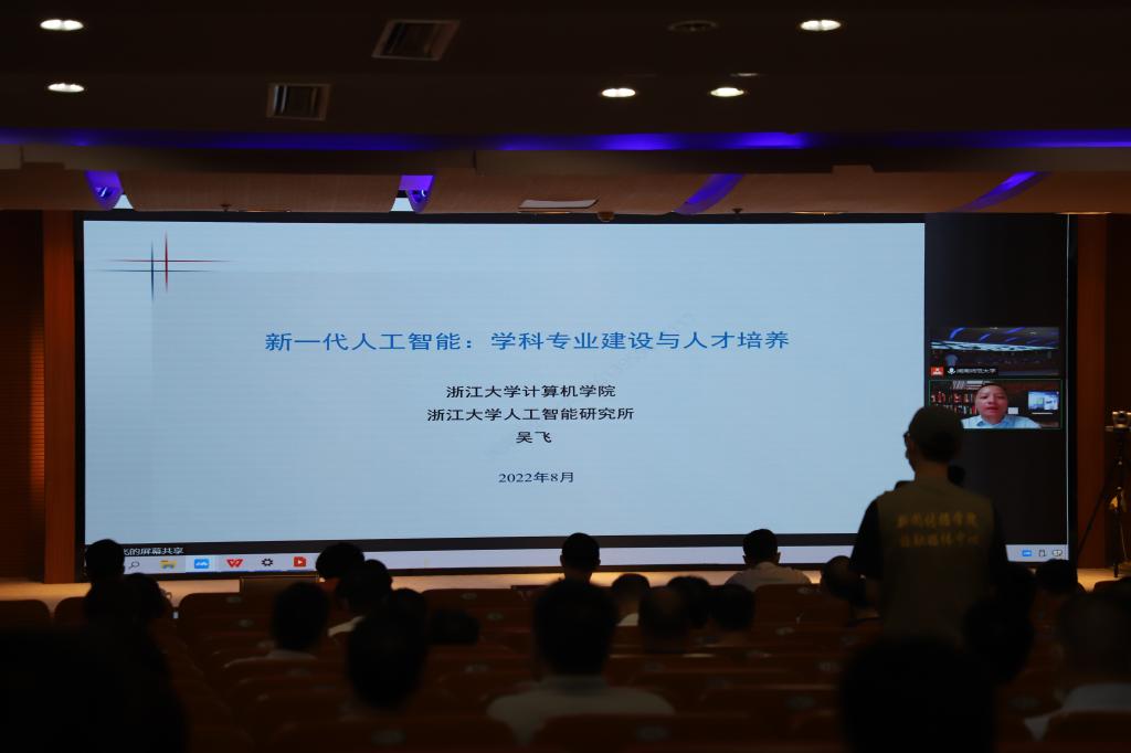 吳飛教授首先作了題為《新一代人工智能:學(xué)科專業(yè)建設(shè)與人才培養(yǎng)》的專題報(bào)告。他闡述了人工智能的誕生以及新一代人工智能的崛起、國(guó)務(wù)院印發(fā)《新一代人工智能發(fā)展規(guī)劃》的背景、國(guó)家部委和各省份推出的促進(jìn)新一代人工智能發(fā)展的舉措,以及人工智能所具有的學(xué)科交叉內(nèi)稟的特點(diǎn)和人工智能正在引發(fā)的科學(xué)研究范式變革。他介紹了當(dāng)前我國(guó)人工智能學(xué)科專業(yè)建設(shè)和人才培養(yǎng)的基本情況,重點(diǎn)介紹了計(jì)算機(jī)領(lǐng)域本科教育教學(xué)改革試點(diǎn)工作計(jì)劃的核心內(nèi)容、課程設(shè)置,深入講解了浙江大學(xué)在提升人工智能領(lǐng)域教育教學(xué)水平和夯實(shí)優(yōu)勢(shì)方面的做法,特別是“教材、課程和實(shí)訓(xùn)平臺(tái)”三位一體交叉人才培養(yǎng)、“AI+X微專業(yè)”模式的探索。吳飛教授表示,人工智能是引領(lǐng)新一輪科技革命、產(chǎn)業(yè)變革和社會(huì)發(fā)展的戰(zhàn)略性技術(shù),具有溢出帶動(dòng)性很強(qiáng)的頭雁效應(yīng),將在使能技術(shù)、賦能社會(huì)方面作出積極貢獻(xiàn)。