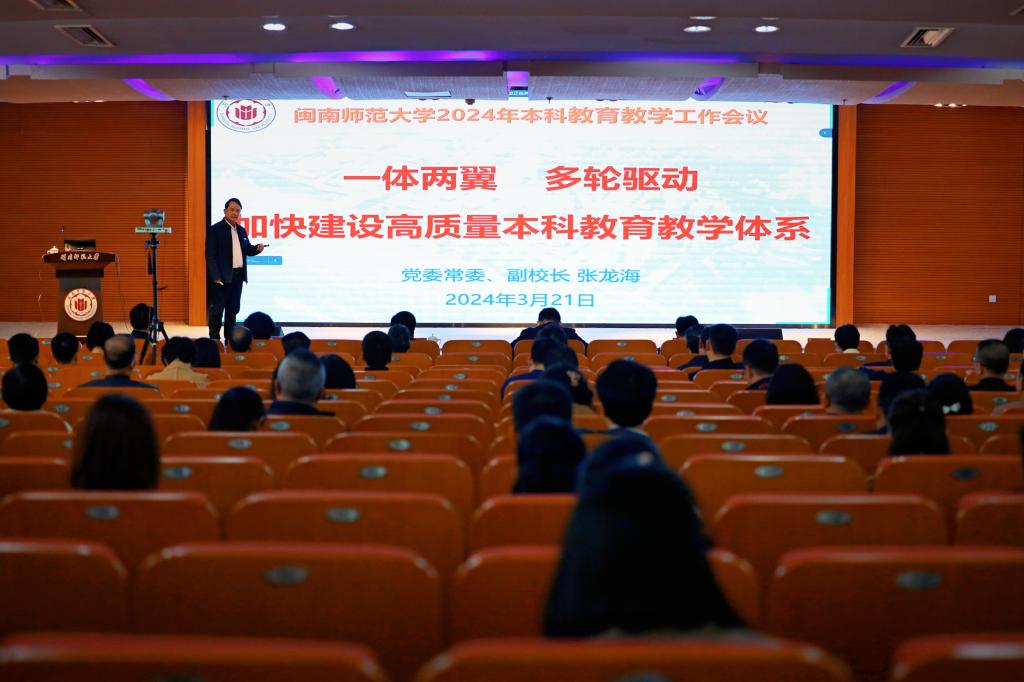 會(huì)上,校黨委常委、副校長張龍海作題為《一體兩翼 多輪驅(qū)動(dòng) 加快建設(shè)高質(zhì)量本科教育教學(xué)體系》的工作報(bào)告。張龍海總結(jié)了學(xué)校本科教育教學(xué)審核評(píng)估工作的情況,盤點(diǎn)2023年工作成績和當(dāng)前教學(xué)現(xiàn)狀,分析存在的主要問題,并就2024年本科教育教學(xué)工作進(jìn)行部署。他表示,下階段學(xué)校將繼續(xù)扎實(shí)推進(jìn)本科教育教學(xué)改革,構(gòu)建以審核評(píng)估整改為導(dǎo)向、以專業(yè)建設(shè)和學(xué)術(shù)型人才培養(yǎng)為抓手的“一體兩翼”新格局,探索金專、金課、金師、金教材多輪驅(qū)動(dòng)模式,為建設(shè)高質(zhì)量本科教育體系努力奮斗。