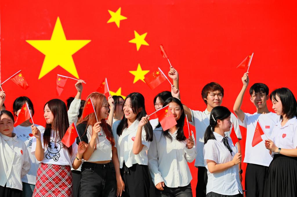 國慶節到來之際,閩南師范大學校園里各處紅旗招展,洋溢濃厚節日氛圍。閩南師大學子在校園里與國旗同框留影,用實際行動喜迎國慶。(董征 攝)