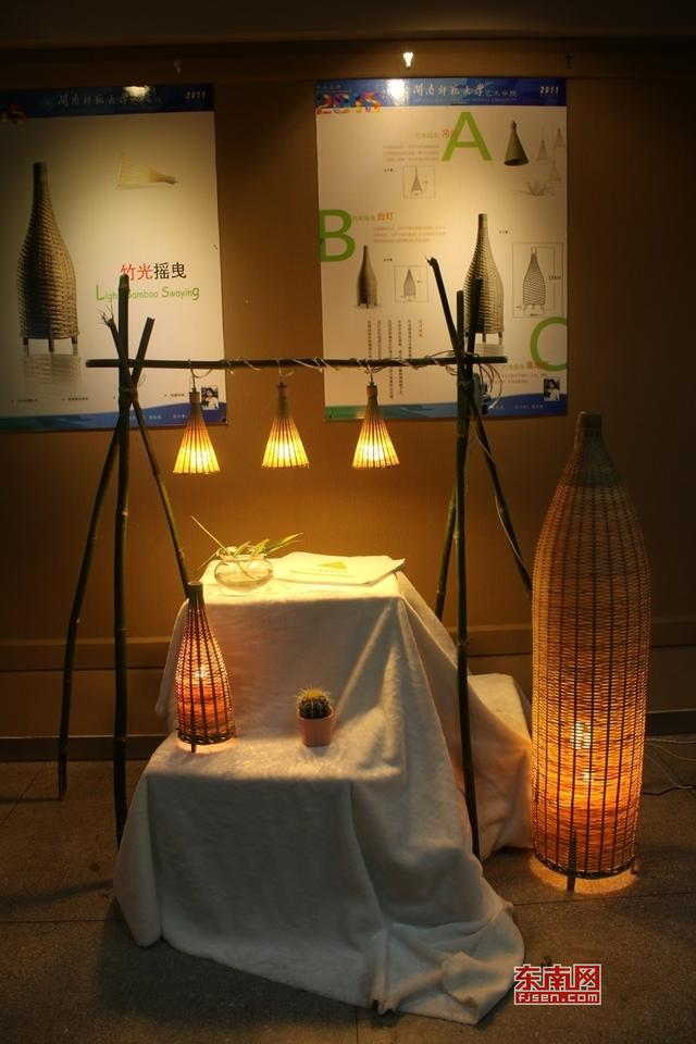 在展覽現場,許多產品設計作品頗具創意,引人駐足。如,以吸管為靈感設計的,讓水龍頭能像吸管一樣自由彎折的“360度智能恒溫水龍頭”;以藏族轉經筒為靈感設計的,極具觀賞性的“鐘意”時鐘;用遙控可指示左轉,右轉,直行信號燈的“騎行安全背包”等。還有幾件燈具和茶具的設計,如“竹光搖曳”和“菩提心”等作品,則是將漳州傳統竹編、藤編工藝進行改造升級,實現傳統產業的創新。其中,名為“菩提心”的燈具設計作品吸引了許多同學駐足觀賞。燈具造型時尚,暖黃色的燈光從竹藤編織的縫隙中透出來,古樸又不失現代感。作品的設計者黃孝敏同學介紹道,“這件作品是和搭檔兩人通過網絡自學竹編藤編工藝,自己動手編織了近半年才完成的,主要也是為了將傳統的工藝通過設計,煥發出新的生命力,更具現代感時尚感。”