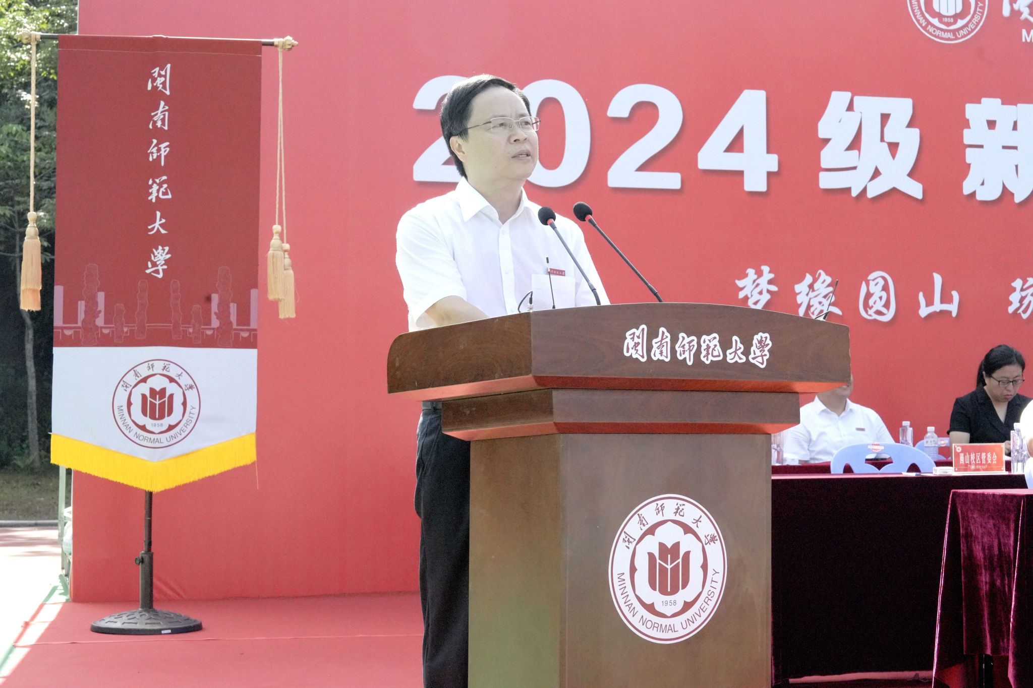 在圓山校區(qū),林致遠(yuǎn)回顧了圓山校區(qū)的辦學(xué)歷程和歷史底蘊(yùn),并以閩南師范大學(xué)校訓(xùn)與新同學(xué)共勉,希望同學(xué)們要拓展博學(xué)的治學(xué)視野,廣泛涉獵知識(shí),關(guān)注學(xué)科的交叉融合,掌握高效的學(xué)習(xí)方法贏得發(fā)展的主動(dòng)。要形成明理的人生格局,胸懷祖國,明辨是非,將聰明才智奉獻(xiàn)給社會(huì)和祖國的美好未來。要樹立礪志的學(xué)習(xí)態(tài)度,立大志、修大德、成大事,在自立自強(qiáng)的信念中凝聚勇氣和力量。要培養(yǎng)篤行的意志毅力,發(fā)揚(yáng)面壁十年圖破壁的破繭精神,知行合一,厚積薄發(fā),努力實(shí)現(xiàn)人生的蛻變和升華。